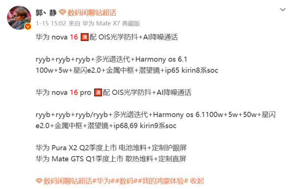 据CNMO了解,该博主此前曾曝光过华为nova16系列的相关配置。当时的爆料信息显示,华为nova16全系将搭载HarmonyOS6.1操作系统和星闪2.0,还有金属中框、AI降噪通话等配置功能。